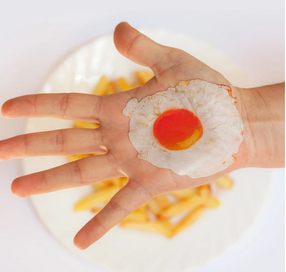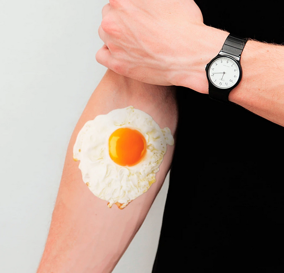 A fried egg cooked in your skin. A unique realistic tattoo by Tattoonie Premium Temporary Tattoos.