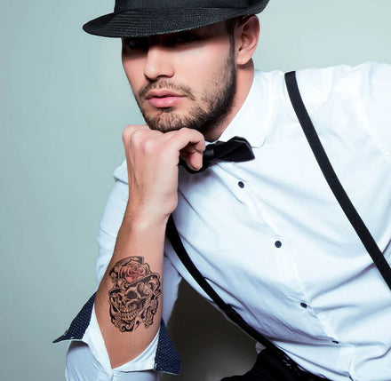 Skull tattoos and skeletons are very popular tattoo themes. Here you 'll find a lot of skull and skeleton temporary tattoos: pirate skull, skull and bones, fire skull, angel skull, butterfly skull, poison skull, skull armband, skeleton, eagle skull, skull 'n roses,...