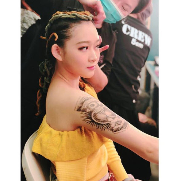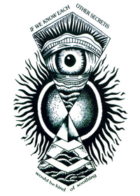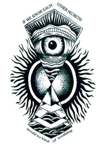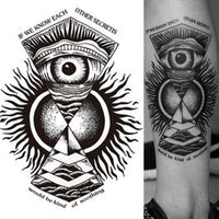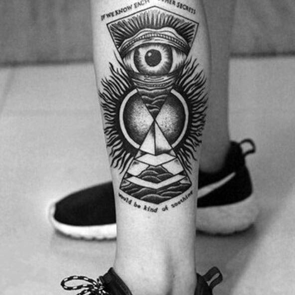A large geometric temporary tattoo with an eye and the text ' If we know each other secrets, would be kind of soothing'