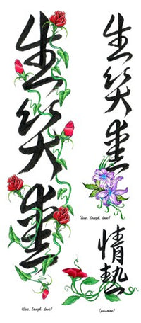 Palabras en chino para "Live, Laugh, Love" (Vive, ríe, ama) y "Passion" (pasión) y flores tatuajes temporales.