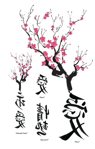 Cerisiers en fleurs Asiatique et les mots chinois pour "l'amour", "Passion" et "amour éternel" tattoos éphémères.