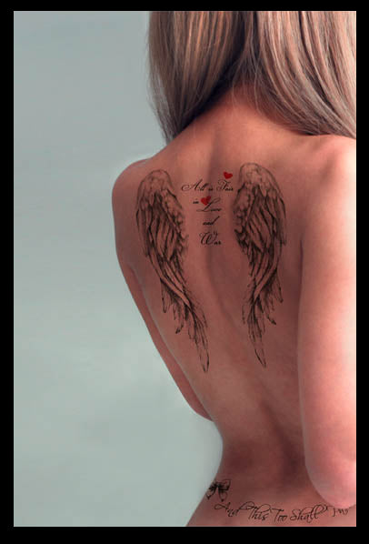 Skyn Demure Quotes tattoos temporaires: "And this too shall pass", "All is fair in love and war", "Every saint has a past every sinner has a future ", "Thou shall not judge", "Nothing is permanent" avec des archets (noeuds) et des coeurs.
