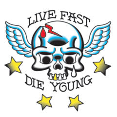 Crâne avec le texte "Live Fast Die Young" (vit vite, meurt jeune) tattoo temporaire