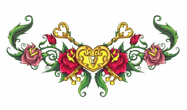 Coeur verrouillé avec des roses tattoo temporaire dos bas