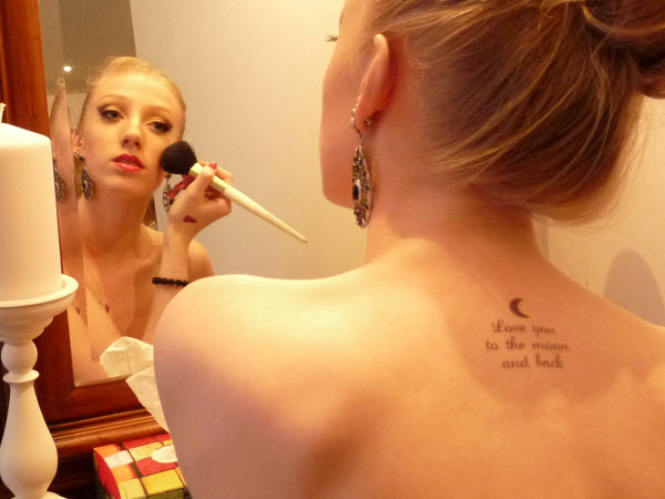 Tatouage hyper romantique avec la lune et le texte "I Love You To The Moon And Back" (je t'aime à la lune et retour) tatouage éphémère.