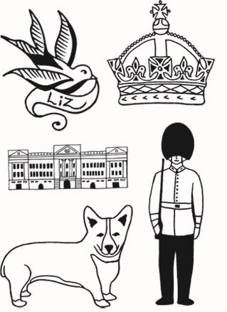 Lydia Leith jubilé "Oh My Garde" tatouages ??temporaires avec un oiseau (avec le texte "Liz"), une couronne, un château, un chien et un garde royal.