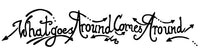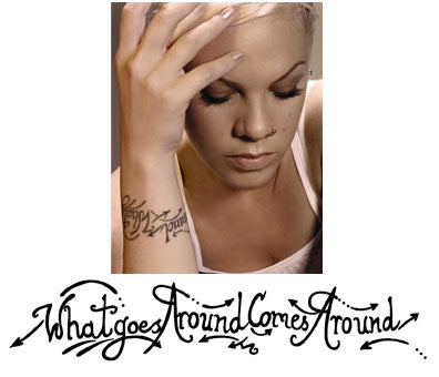 Tatouage temporaire fantastique pour le poignet de la chanteuse americain Pink avec le texte "What Comes Around Goes Around".