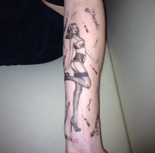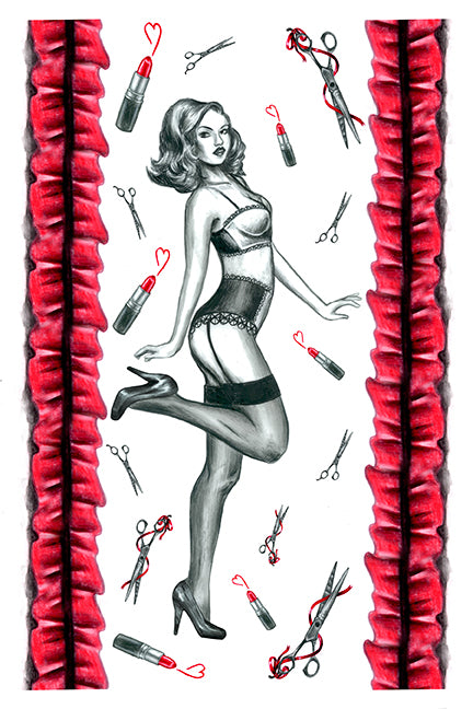 Soyons tout à fait rétro avec cette pinup, jarretières rouges et petits ciseaux Skyn tatouages ??temporaires Demure haute couture.