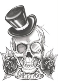 Crâne avec un chapeau et des roses et le texte "Vampyros" tattoo éphémère gothic de Tinsley Transfers
