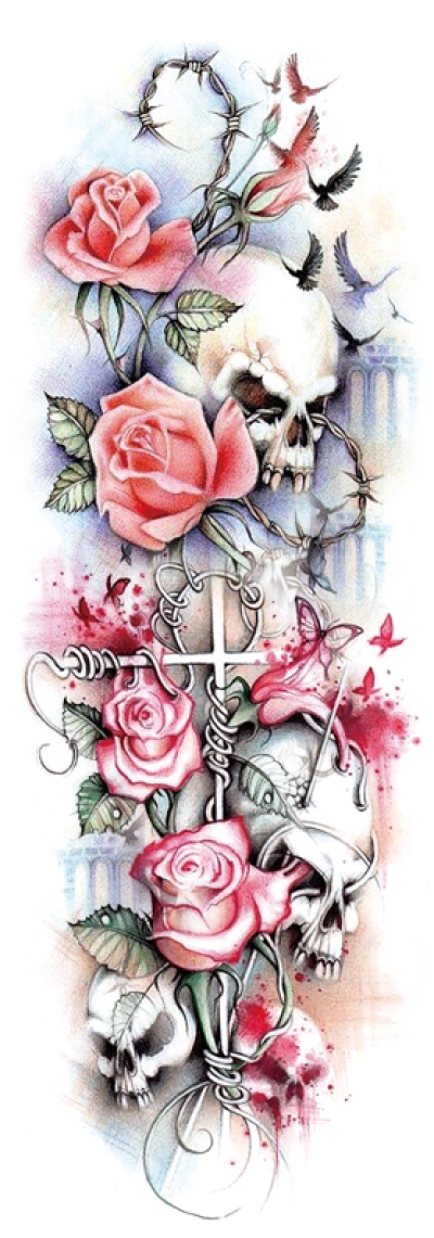 Coprite l'intero braccio o la gamba con questo tatuaggio temporaneo con rose e teschi.