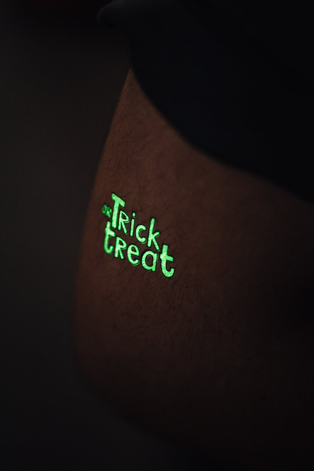 Met deze glow in the dark nep trick or treat tattoo ben je meteen in de Halloween stemming. Ik zou je niet graag in het donker zien...