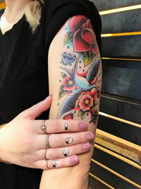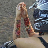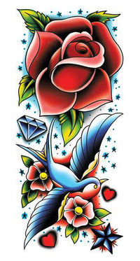 Deze tijdelijke tattoo half-sleeves werden ontworpen naar een traditionele zwaluw en een rozentattoo. Dit mooie artwork toont een kleurrijke rode roos en een blauwe zwaluw met levendige details.