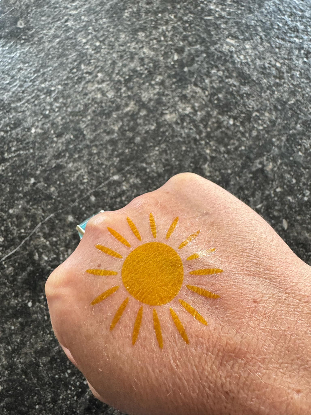 Maak kennis met onze anti-verbranding tijdelijke tattoo Sun! Dit stralende symbooltje helpt je te weten wanneer het tijd is om opnieuw zonnecrème aan te brengen, zodat je kan genieten van de zon zonder je zorgen te maken over brandwonden. Hou je huid veilig terwijl je nog steeds geniet van zonnige dagen - want zelfs de zon kent het belang van zonnecrème!