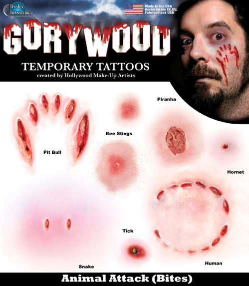 The animal attacks and bites from Gorywood Tinsley Transfers temporary tattoos look amazing (pit bull, bee, piranha, hornet, human, tick and snake bites)!