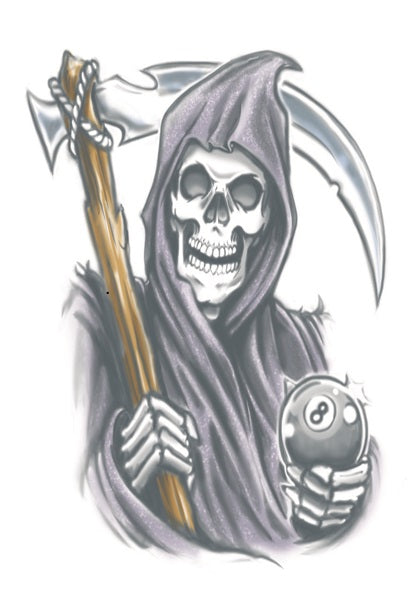Biker reaper with with scythe and 8-ball Tinsley Transfers temporary tattoo.