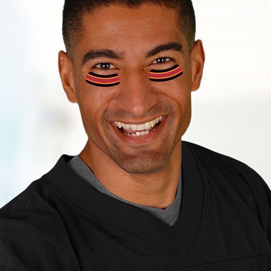 2 Black, orange and red Eye Black temporary tattoos. Eye Black temporary tattoos are temporary tattoos applied under the eyes to reduce glare. And you will look more dangerous to your opponent!