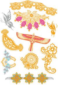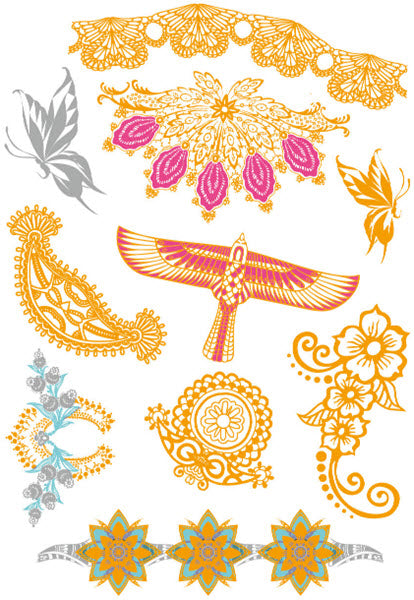 This set contains henna gold jewelery, butterflies, an Egyptian bird and colorful flowers.