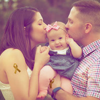 The international awareness symbol for Childhood Cancer is the gold ribbon. Unlike other cancer awareness ribbons, which focus on a singular type of cancer, the gold ribbon is a symbol for all forms of cancer affecting children and adolescents. This metallic gold ribbon temporary tattoo is perfect for showing awareness for childhood cancer.
