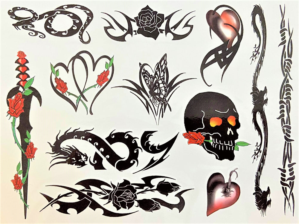 Several temporary tribal tattoos with dragons, roses and a skull.