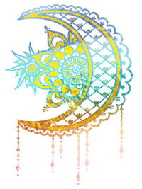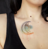 Metallic Prismfoil crescent moon in flashy rainbow foil. Wear this Prismfoil moon temporary tattoo on festivals as a unique alternative to traditional jewelry.