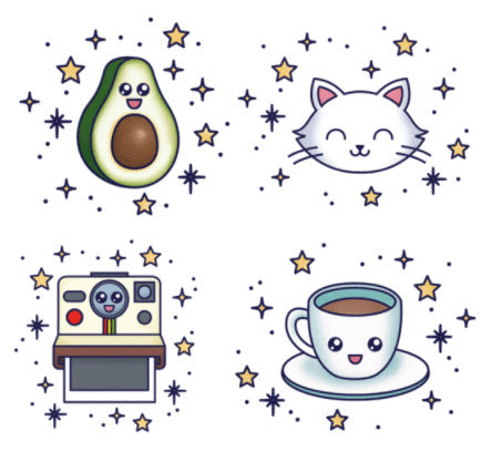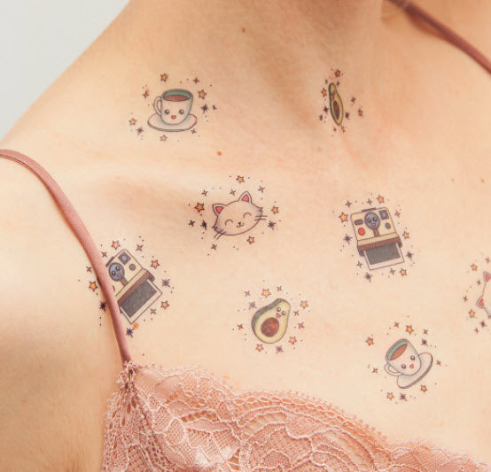 Multi Love II, coffee, an avocado, stars, a polaroid and a cat by Tattoonie Premium Temporary Tattoos.