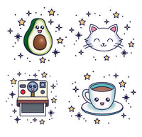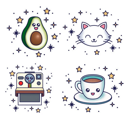Once upon a time, the cutest avocado, Kitty the kitten, the little Polaroïd and the sweet Cup by Tattoonie Premium Temporary Tattoos.