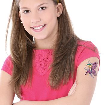 Mythical purple fairy temporary tattoo. This is a 21st century fairy with a new look and attitude. She has a stylish new haircut so those old-school flowing locks don't get in her way as she spreads magic and joy throughout the kingdom.
