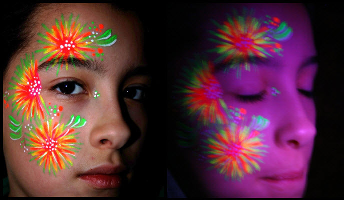 Bright magenta face and body paint to be used for special effects, which also glow under UV light or blacklight. Using a fine brush you can decorate your face or body with anything your heart desires. Perfect for Neon parties, Raves, Night Clubbing, Festivals and anywhere you want the brightest colour. The colours have fantastic coverage with rich colour finishes.