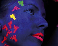 Bright yellow face and body paint to be used for special effects, which also glow under UV light or blacklight. Using a fine brush you can decorate your face or body with anything your heart desires. Perfect for Neon parties, Raves, Night Clubbing, Festivals and anywhere you want the brightest colour. The colours have fantastic coverage with rich colour finishes.