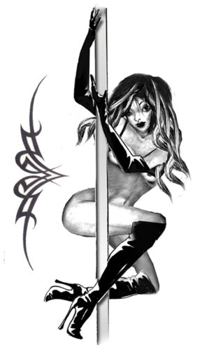 Pole dancer with long black boots and gloves in action, with band temporary tattoo.