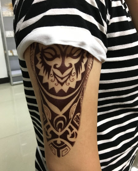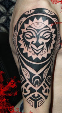 A maori temporary tattoo sleeve with a typical polynesian shield.
