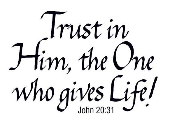 Biblical verse John 20:31 temporary tattoo with text 'Trust in Him, the One who gives Life.'