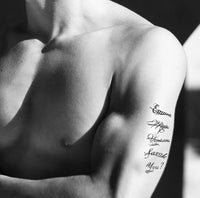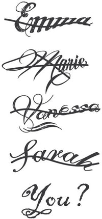 Very humorous temporary tattoo with 4 crossed out names of women (Emma, Marie, Vanessa & Sarah) and the challenging question "You?".