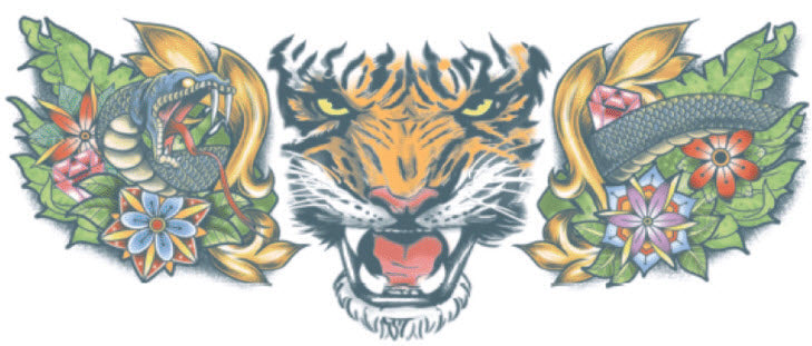 Pescoço tatuagem temporária com um tigre e cobra com flores. Esta tatuagem de pescoço de tigre e cobra é uma das mais belas tatuagens de pescoço que temos!