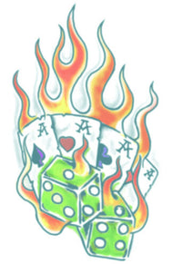 Tatuagem Passageira de Áses de Mota, quatro áses com dado e chamas de Tisnley Transfers.