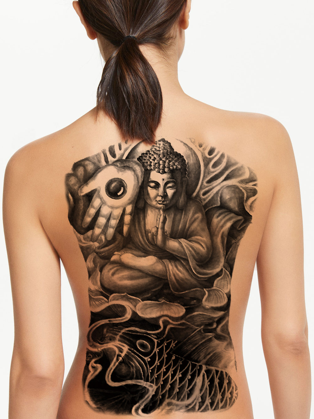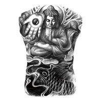 Cubra todo o seu dorso com um Buda desenhada ao estilo da velha escola asiática por T4AW Temporary Tattoos.