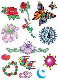 Folha de tatuagem temporária multi com borboletas, rosas, yin yang, punhal, flores, corações, sol, lua e estrela.