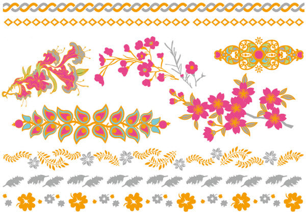 Este set contém flores, penas e correntes cor-de-rosa, prateadas e douradas.