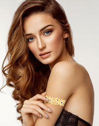 Tatuagens temporárias de desenhos florais e pulseiras douradas com pedras preciosas.