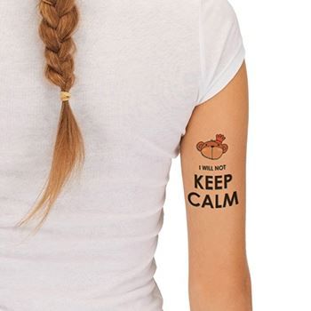 Tatuagem temporária com um macaco a usar uma coroa e o texto "I Will Not KEEP CALM" (Eu Nã Vou MANTER A CALMA)