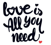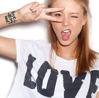 Tatuagem temporária com o texto "Love Is All You Need" (Amor é Tudo O Que Você Precisa)