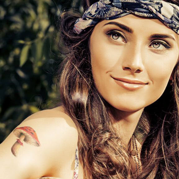 Reviva a sua infância interior com esta tatuagem temporária de cogumelos. Esta tatuagem é perfeita para os amantes da natureza ou para as crianças que se vestem como fadas para o Halloween.