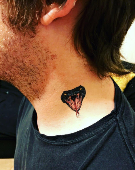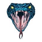 Tatuagem temporária de uma cabeça de uma cobra venenosa azul com uma língua bifurcada e olhos amarelos.