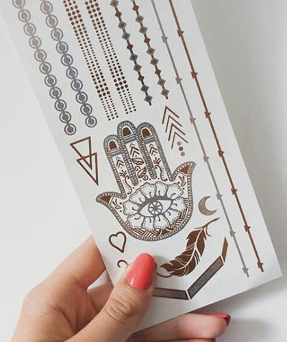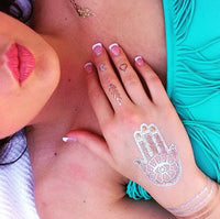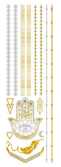 Este fabuloso conjunto de tatuagem de jóia Prismfoil é certo para receber elogios! As pulseiras e gargantilhas de ouro e prata sã perfeitas na praia ou na piscina, e para uso diário. Este conjunto inclui uma mã de fatima belamente projetada e tatuagens de anel menores.