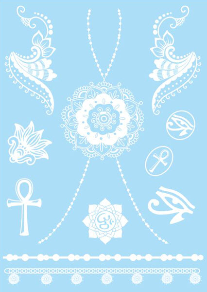 Conjunto de tattoos brancas com a mandala, bracelete de henna, Ohm, olho de horus, Ankh e fantaisa de henna tatuagens provisórias.